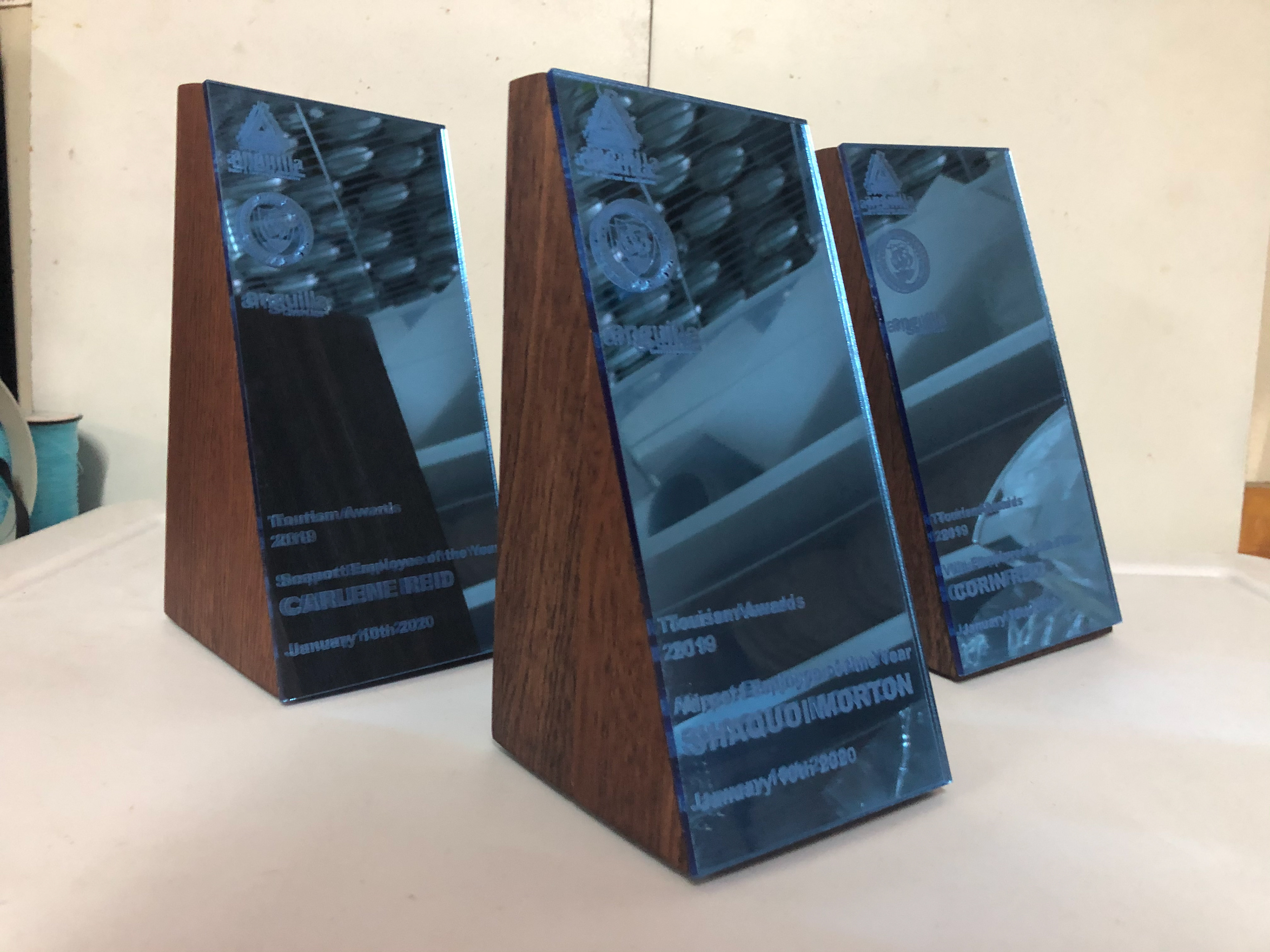 The idea behind the new Anguilla Tourism Awards is a deep as it is simple. Locally purchases and crafted mahogany with mirrored acrylic plates displaying subtly, the award being received and the awardee along with the logo of the Anguilla Hotel and Tourism Association, the Anguilla Tourist Board and the Government of Anguilla; the three entities responsible to supporting the majority of this awards gala and ceremony. We also have the direct award sponsor's name on each award. However what really puts the icing on this cake is the fact the the mirrored acrylic reflects the face of the person looking at the award, so the recipient is viewing their award while also physically being represented on the award as well. Does it get more personal?